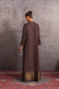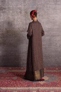Burgundy and indigo long jacket featuring intricate appliqué embroidery, full sleeves, a stand collar, and brocade borders.